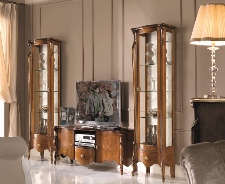 Mueble para TV de líneas muy clásicas y detalles tallados. Una bonita superficie de apoyo para el televisor, con 2 amplios cajones centrales y 4 compartimentos laterales abiertos para guardar los aparatos y accesorios necesarios en el salón. La gran elegancia se debe a la incrustación de los cajones, enmarcada en un delicado filete rectangular y preciosas tiradores. El mueble se entrega ya montado. Dimensiones: Ancho 158 cm. Altura 60 cm. Profundidad 37 cm.