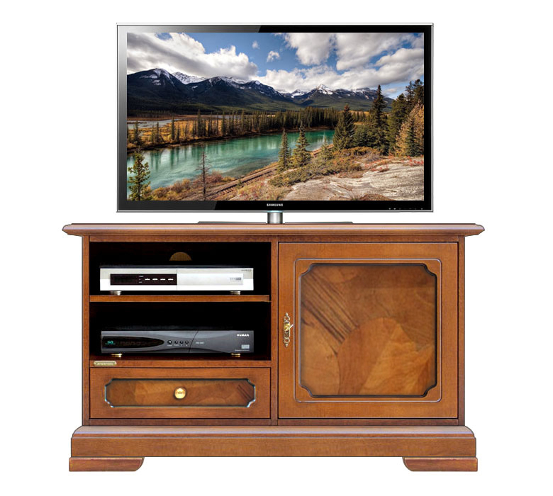 Splendido mobile Porta Tv di media grandezza. Bellissimo e funzionale, racchiude nelle sue contenute dimensioni il massimo della funzionalità e dell'eleganza grazie al raffinato motivo a radica presente nell'antina e nel cassetto.