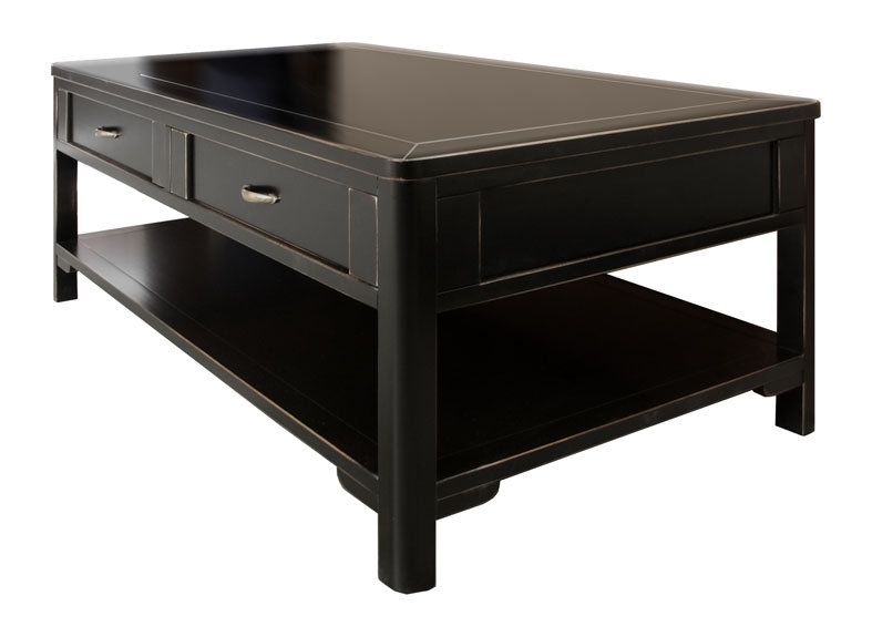 È un tavolino da salotto nero, rettangolare e dalle dimensioni importanti.