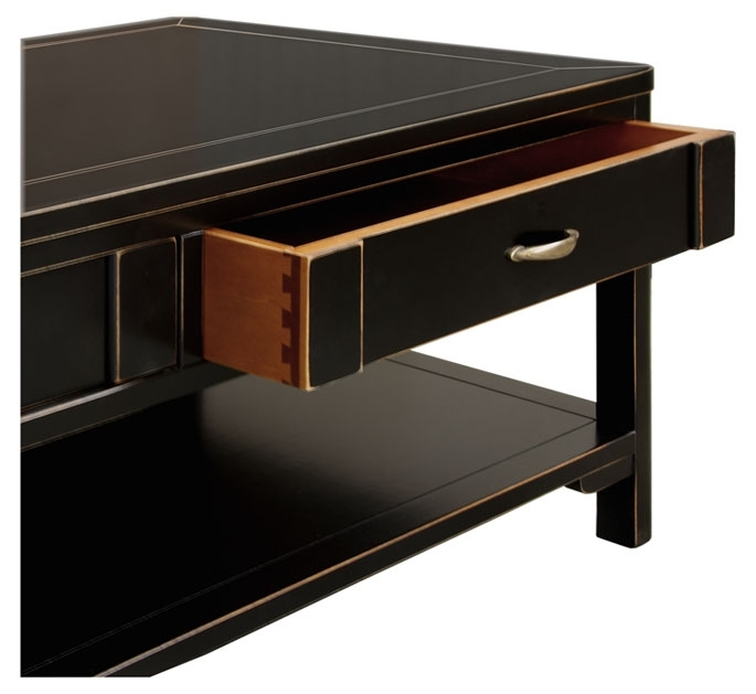 La laccatura, di un bel nero profondo, viene applicata dopo che il mobile è stato trattato con un fondo tinta ciliegio. Dopo la laccatura avviene il processo di spigolatura, ovvero, una delicata lavorazione che asporta lo strato laccato in prossimità degli spigoli e dei bordi lasciando trasparire il sottostante fondo in tinta ciliegio.
