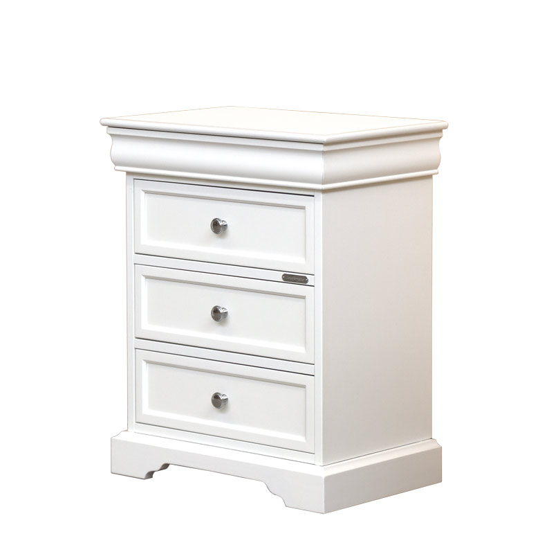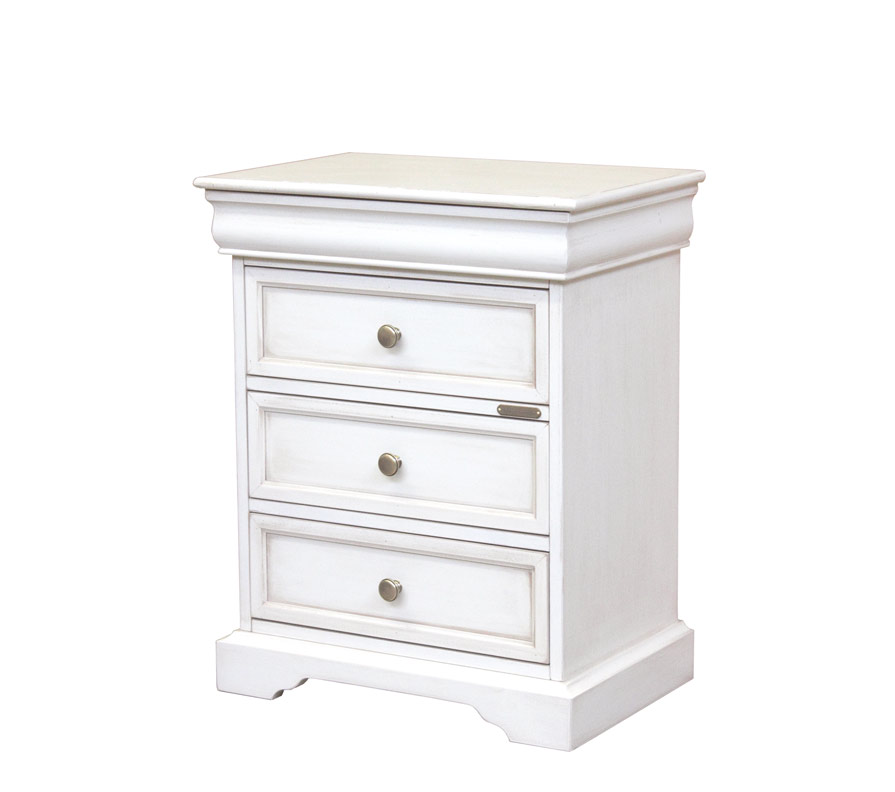 Comodino laccato 3 cassetti, molto raffinato, che farà la gioia di chi desidera dare un tocco di classe e comodità alla propria camera da letto.Un comodino che può essere collocato anche in contesti diversi dalla camera da letto, come ad esempio in entrata, nello studio o in ripostiglio, o comunque dove è necessario utilizzare al meglio uno spazio contenuto.La sua semplice linearità, unita alla raffinatezza della laccatura patinata, fanno di questo mobiletto un piccolo capolavoro di rara bellezza.Ottimo in combinazione con comò a 5 cassetti e con cassettiera a 7 cassetti della stessa collezione.Questo comodino laccato viene consegnato già montato.Dimensioni:Altezza: cm 58Larghezza: cm 53Profondità: cm 34