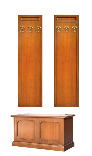 Es una composición simple en la cual el mueble de abajo, libre de cualquier conexión con el perchero de pared, puede colocarse / o de manera diferente usarse también en otros contextos.