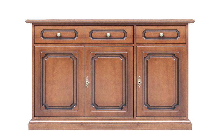Raffinato mobile credenza adatto ad ogni ambiente: un mobile di forma classica che presenta tre antine, caratterizzato da una lavorazione pantografata su corpo unico a ricavare un effetto di solidità e robustezza. Le sue dimensioni rendono possibile la collocazione in ogni spazio della casa.