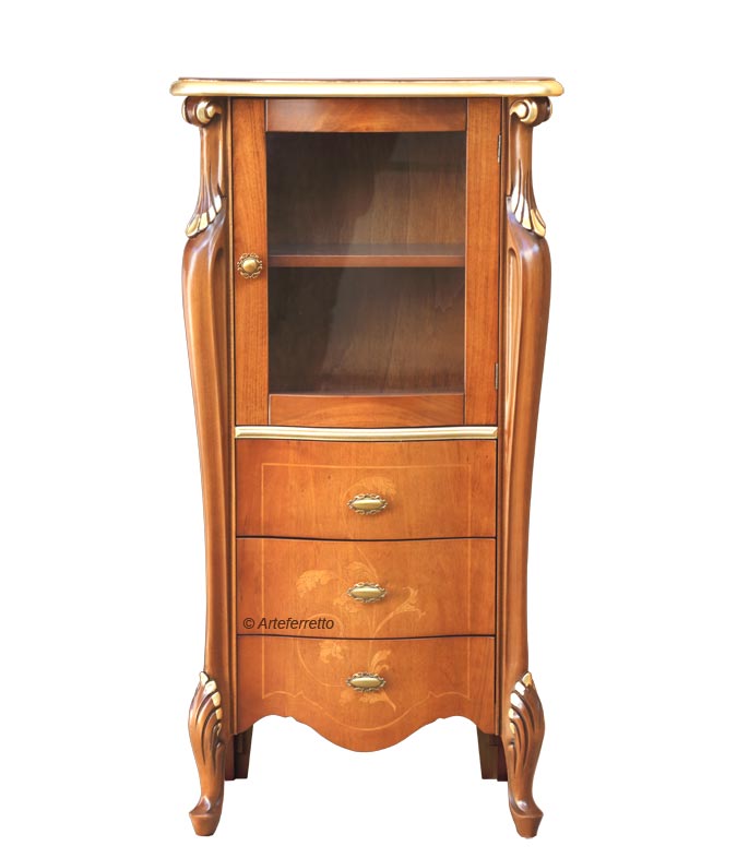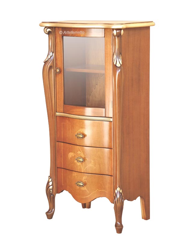 La estructura es enriquecida por tallados y marqueterías que hacen de esta vitrina un mueble de alto valor.