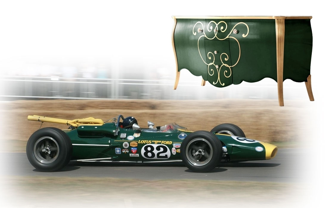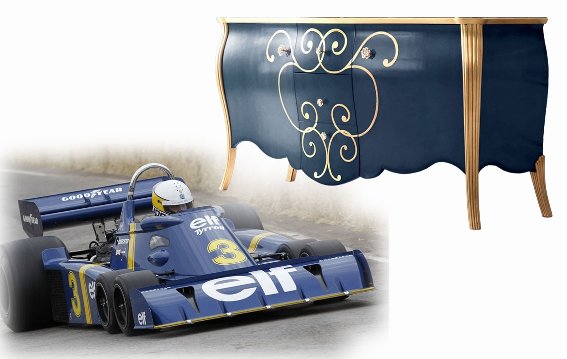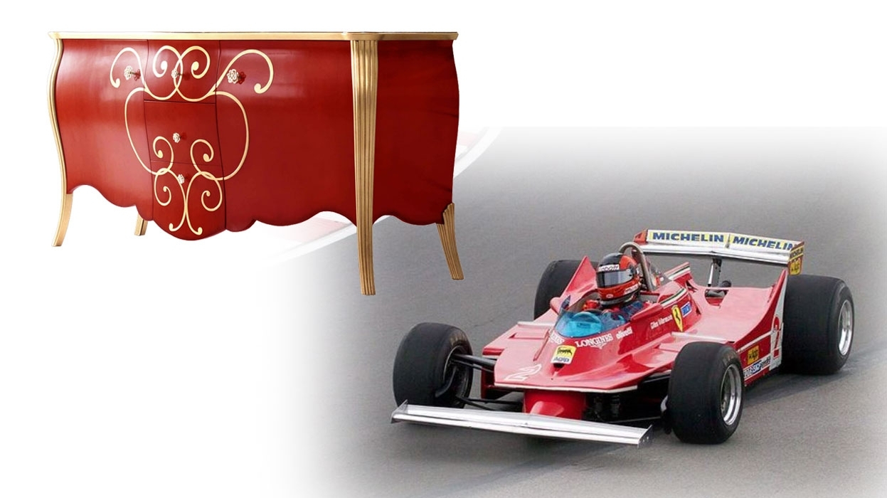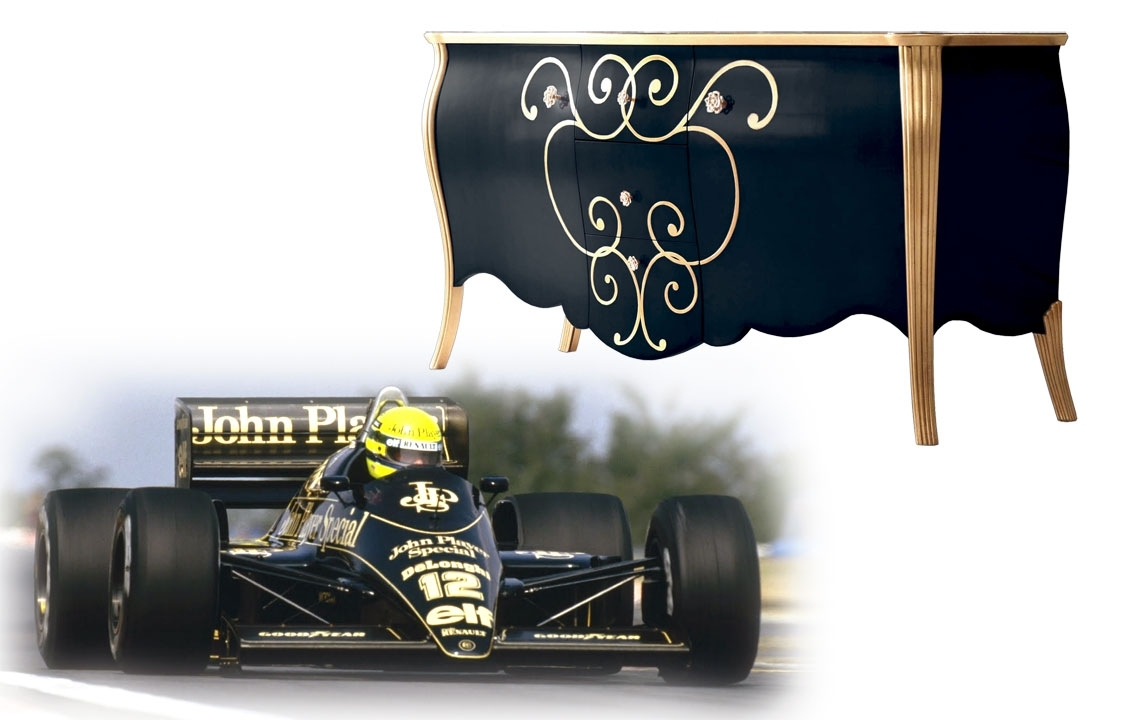 La combinación de los colores de los coches de Formula 1 con las decoraciones doradas hacen de esto mueble una obra maestra.