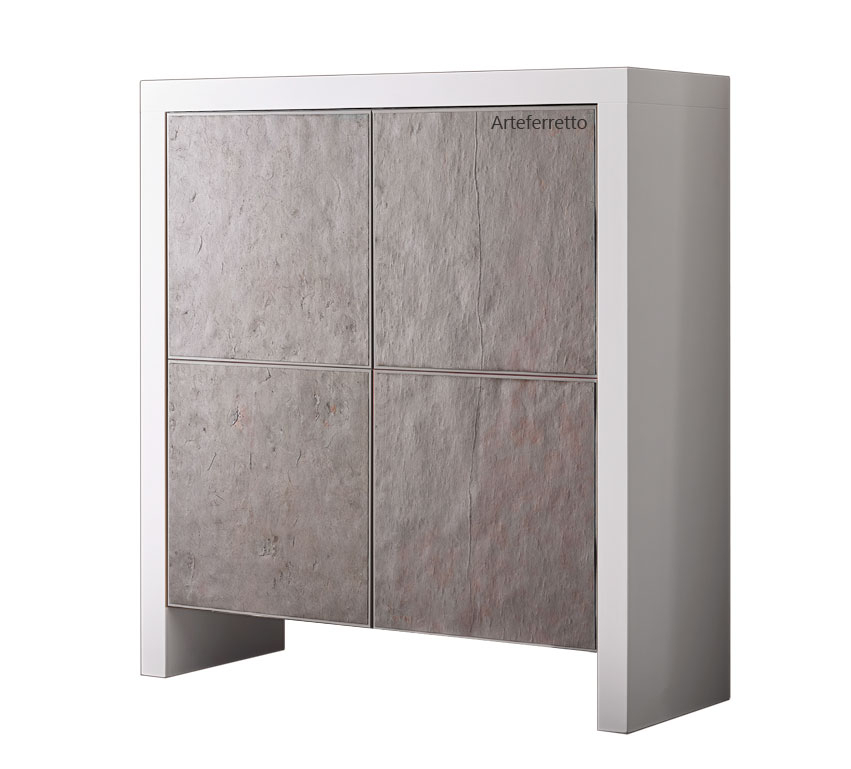 Questa grande madia 4 ante ha la struttura in legno laccato bianco e 4 affascinanti ante ad effetto pietra naturale. Un abbinamento davvero accattivante e ricco di fascino.