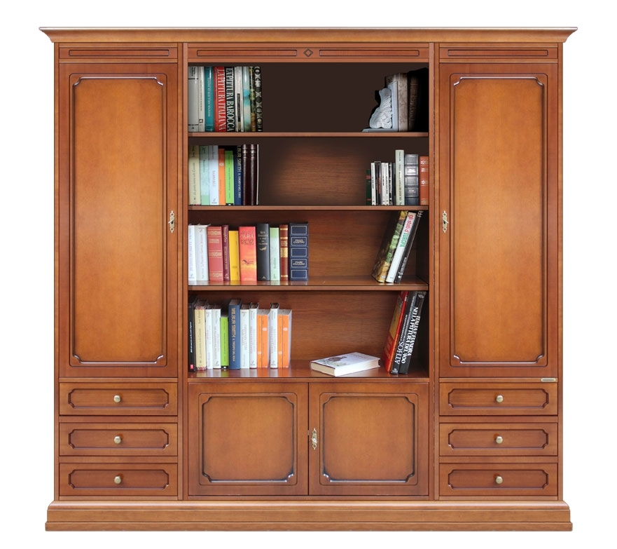 Librería de pared con muebles puertas liberales con tres cajones anchos y puerta baja central.