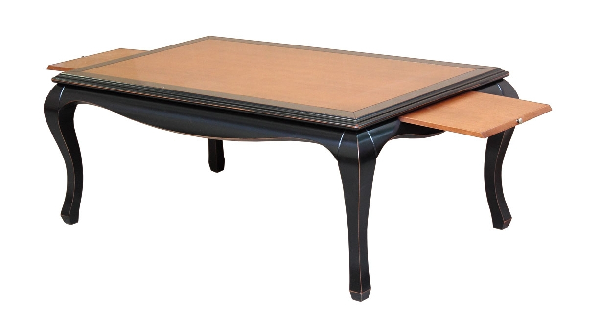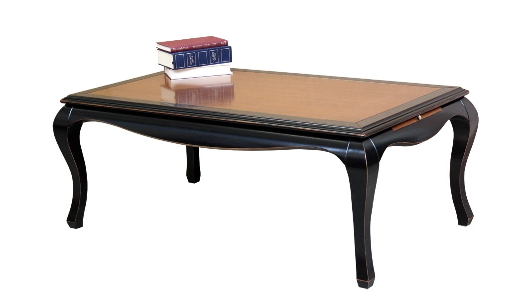 El hermoso acabado laqueado negro del que emerge el cálido tono de cerezo hace un efecto muy agradable a esta mesa de centro con líneas suaves.