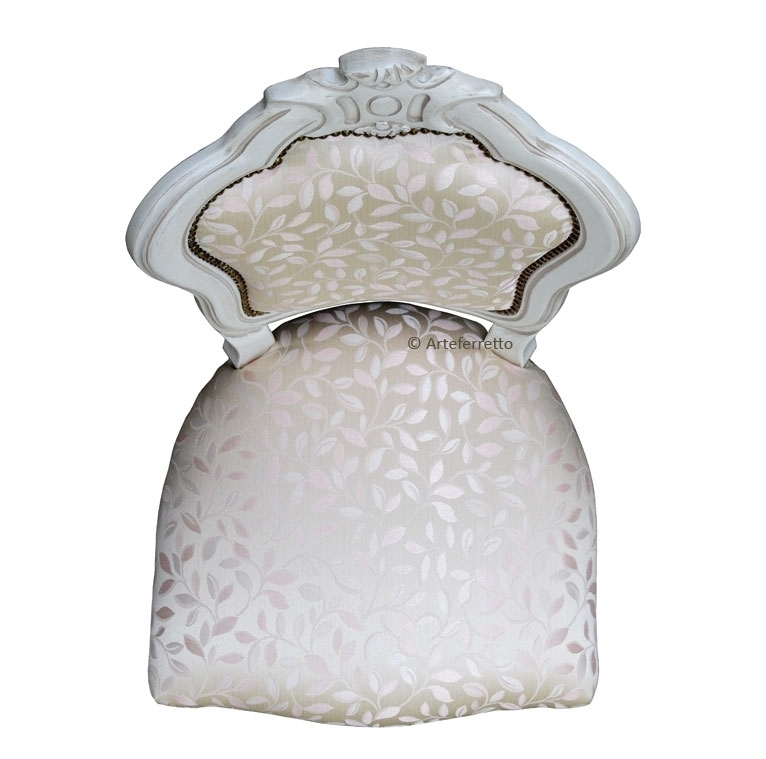 Il telaio in legno ha uno sviluppo armonioso, cesellato qua e là da raffinati intagli, e termina nella parte alta dello schienale con un motivo intagliato ispirato alle antiche decorazioni veneziane.