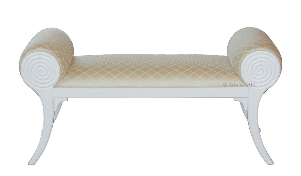 La struttura in legno massello di faggio è modellata con un intrigante disegno che richiama i classici cuscini a cilindro solitamente usati in abbinamento a questo tipo di panca imbottita.