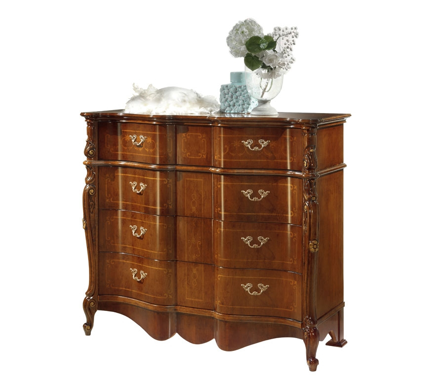 Maestoso comò classico che conquista fin dal primo sguardo, per la maestria delle sue lavorazioni.I materiali, di primissima qualità , sono lavorati con estrema cura da esperti artigiani che, con l'uso di procedimenti tradizionali e grandi abilità , rendono questo comò un'opera d'arte dell'artigianato veneto.La linea, bombata e sinuosa, è decorata da intagli sapientemente dosati che arricchiscono la possente e affidabile struttura.Raffinati intarsi attirano l'attenzione sui tre ampi cassetti, impreziositi da maniglie che riprendono, con la loro forma elegante, i preziosi intagli del mobile.Quattro comodi cassettini ed una ribalta centrale aggiungono funzionalità ad un comò, che vuole essere il protagonista della camera da letto per eleganza e utilità .Dimensioni:larghezza 130 cm;altezza 120 cm;profondità 56 cm.