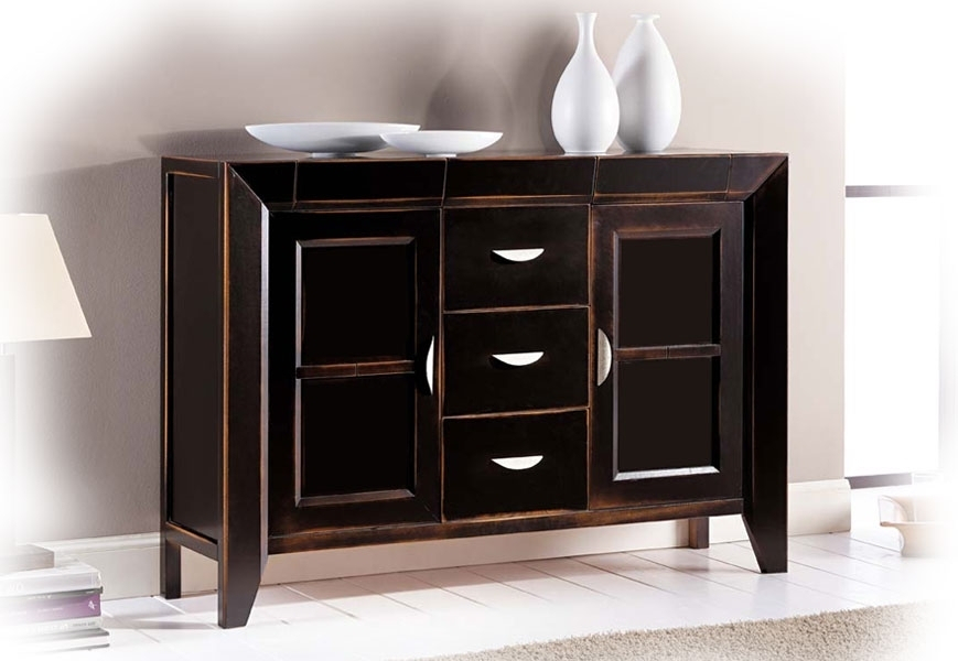 Credenzina dalla linea molto originale che coniuga una forte presenza di legno massello con linee geometriche molto pulite.