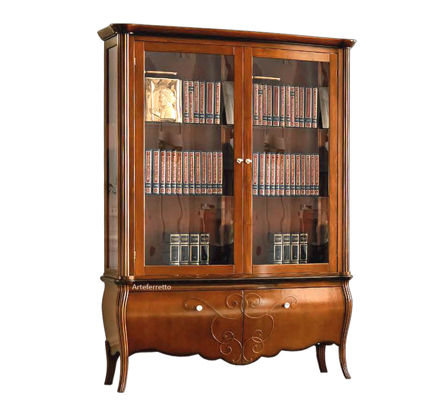 Stile originale ed alta qualità per questa vetrina libreria davvero unica, dove lo spazio è suddiviso tra le vetrine con ripiani in vetro e le elegantissime ante della parte inferiore, dove la linea originale del mobile si fonde con i sinuosi rilievi che disegnano dolcissimi motivi decorativi.