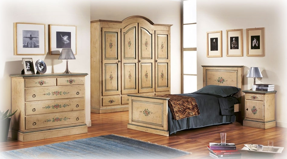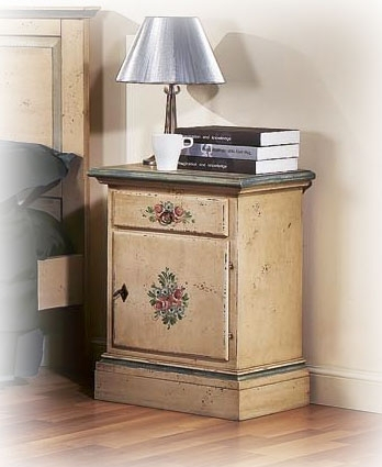 Comodino Antico Decoro ricco di fascino dalla bella finitura laccata anticata e delicati decori floreali che richiamano antiche atmosfere.