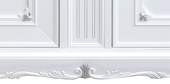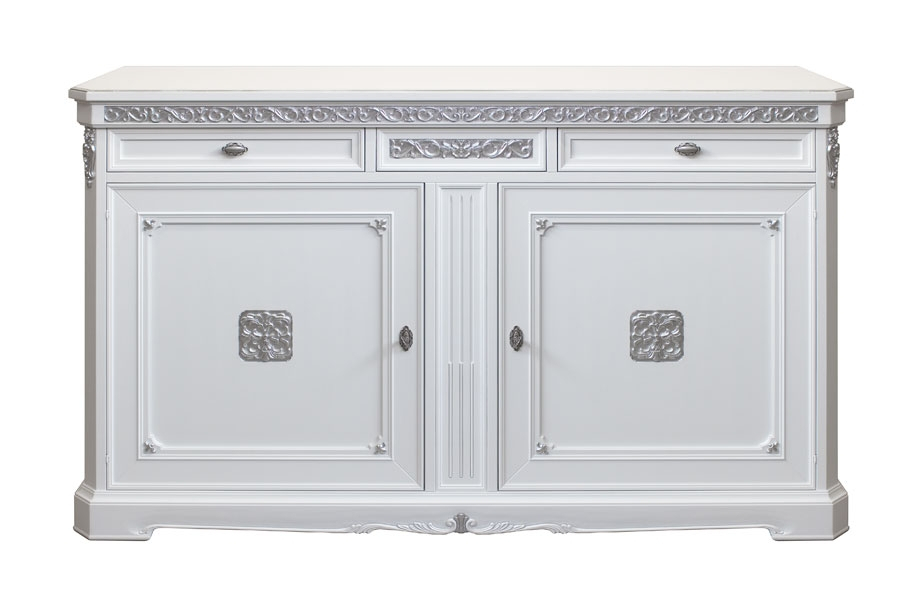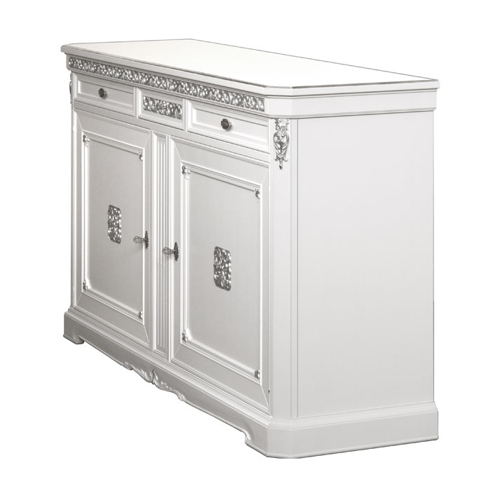 Gracias a los detalles en pan de plata, este precioso mueble realzará cualquier ambiente en el que se coloque: el friso tallado del marco superior y las tallas centrales en las puertas se combinan perfectamente con las preciosas y exclusivas asas del mismo color que completan esta obra de artesanía Made in Italy única.
