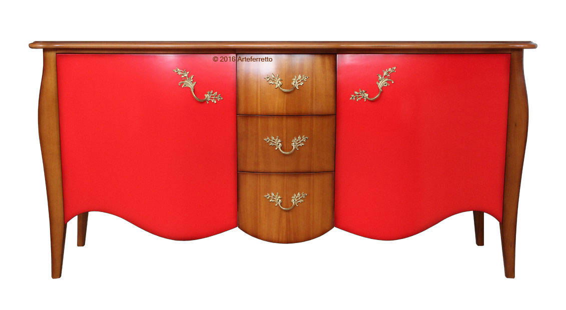 Aparador moldeado bicolor con dos puertas laterales y tres cajones centrales.