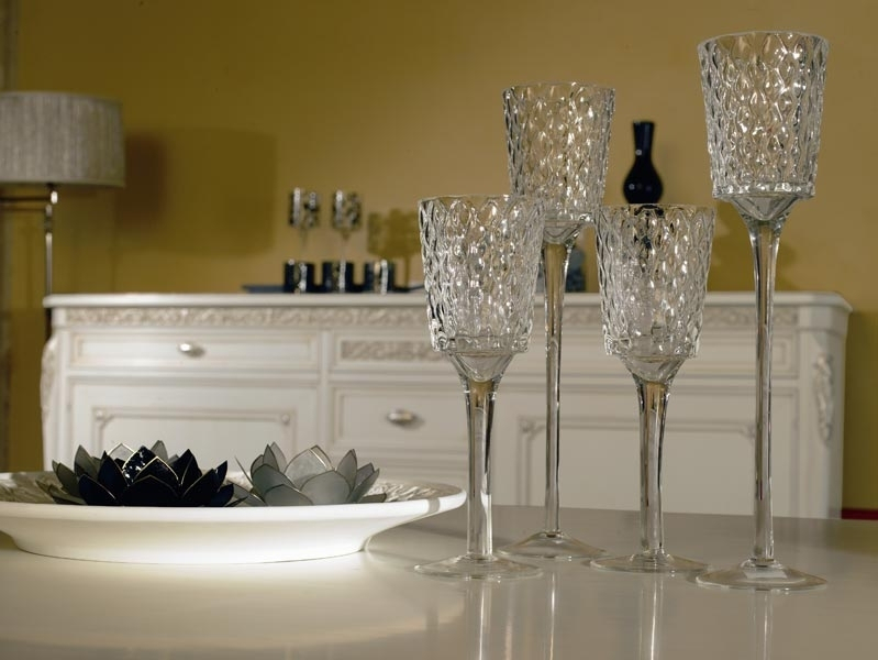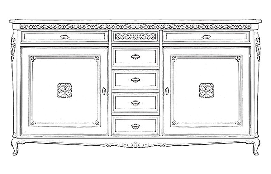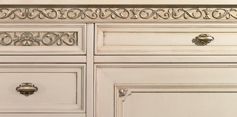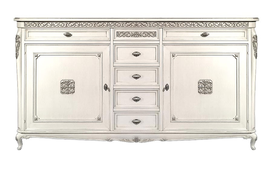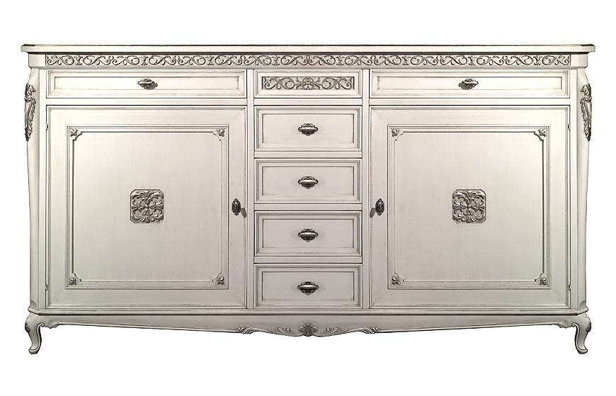 El lacado, de color blanco o marfil, es enriquecido por una pátina que queda bien con los elementos tallados y los de pan de oro o plata. Las puertas tienen en el centro un detalle de gran valor artístico. Las preciosas manillas y los tallados acabados, donan elegancia a este majestuoso mueble.