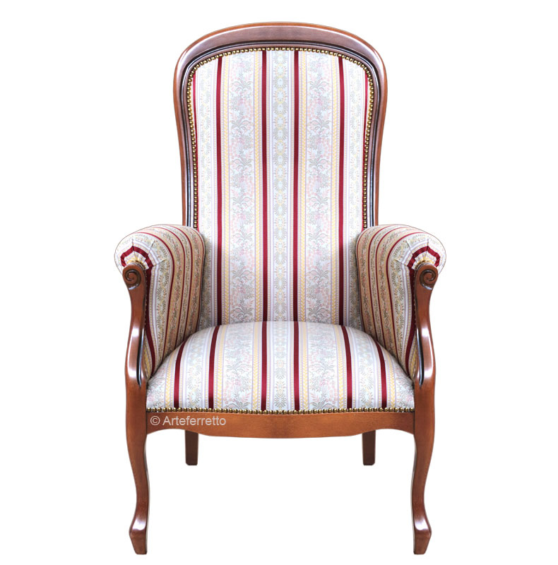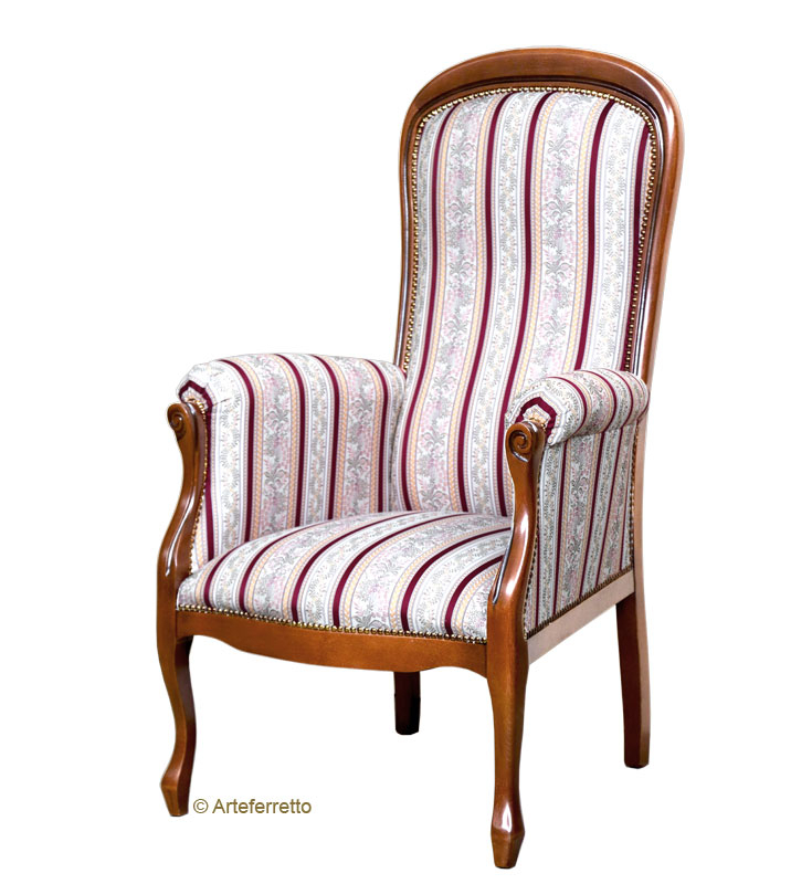 Classica poltrona stile ?Voltaire? arricchita di una imbottitura particolarmente generosa e di ottima qualità.