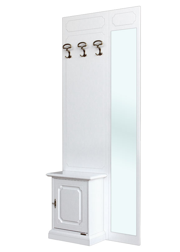 3 ganchos, un espejo ancho y un mueblecito útil.
