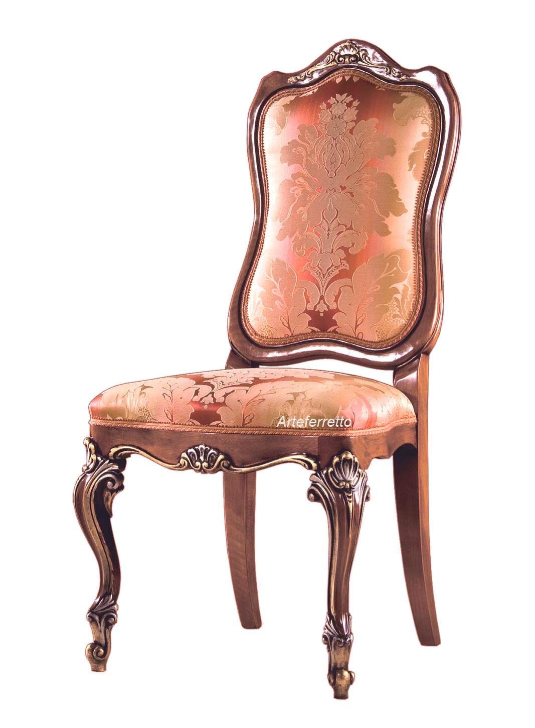 Una silla que ofrece no sólo paz para el cuerpo, sino también placer para la vista, gracias a sus tallas acabadas en pan de oro que decoran y realzan hábilmente las líneas curvas del respaldo y las patas delanteras.