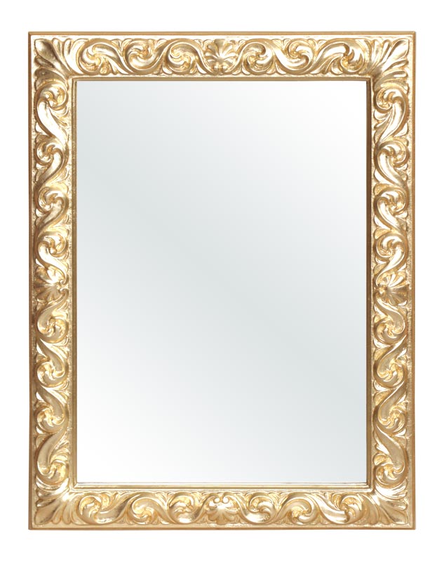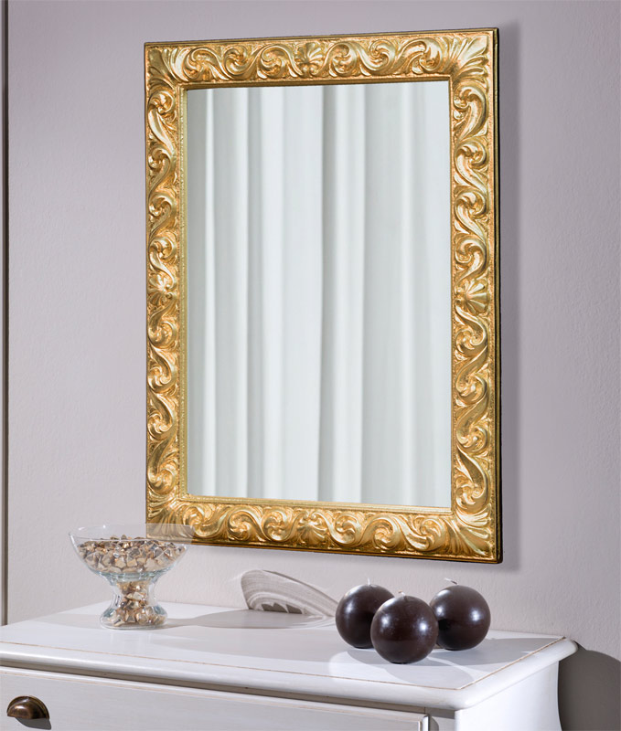 Presentado en pan de oro ligeramente patinado, este espejo puede solicitarse también con acabado diferente (por ejemplo, pan de plata, lacado, etc.).
