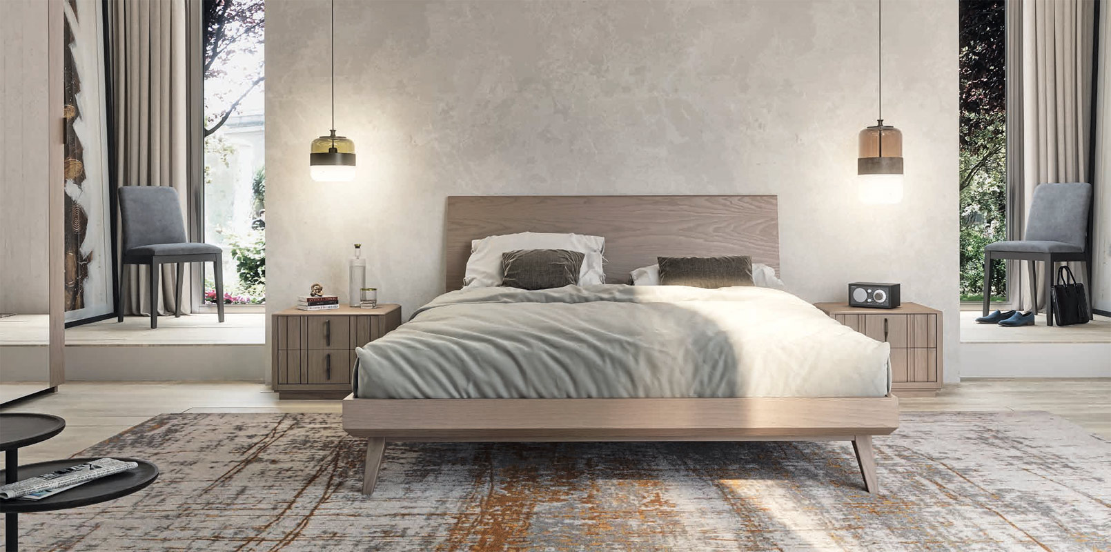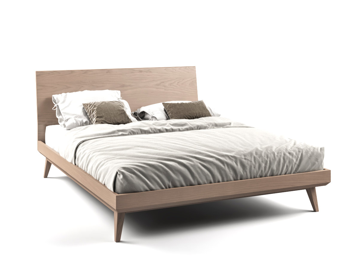 Cama de estilo contemporáneo. Armazón fabricado en fresno macizo y paneles alistonados.