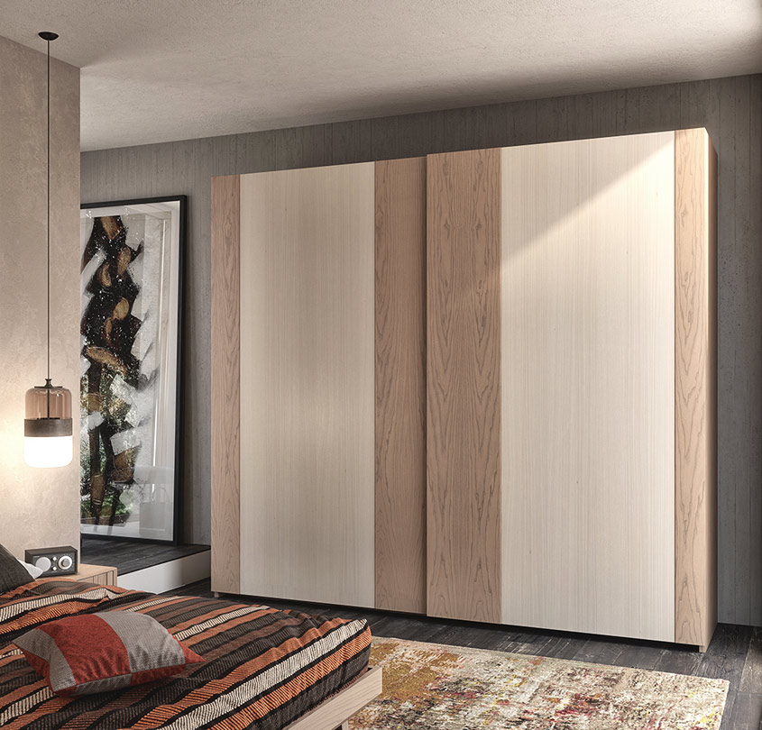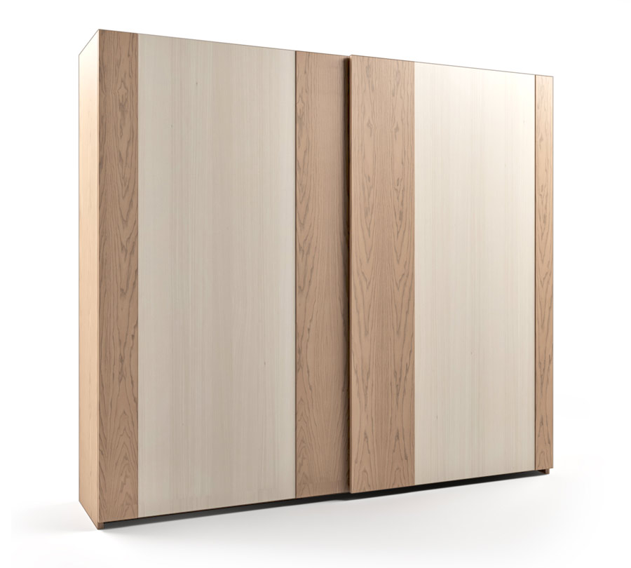 Estructura en paneles alistonados de fresno y dos grandes puertas con cierre suave.