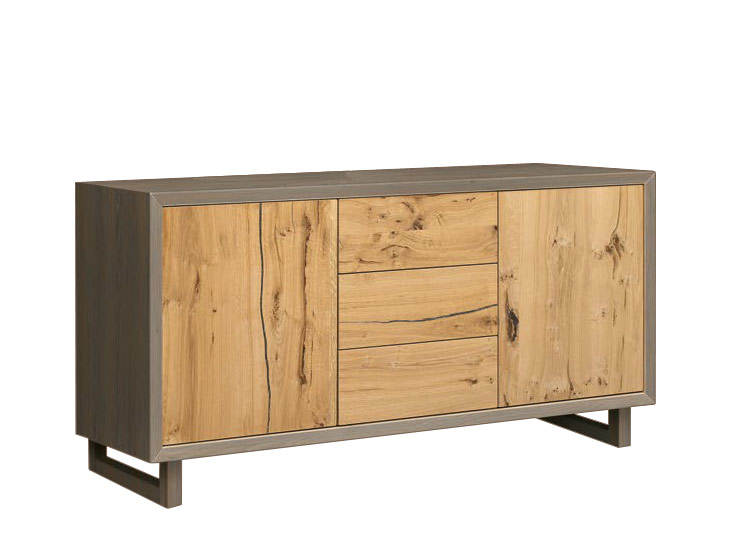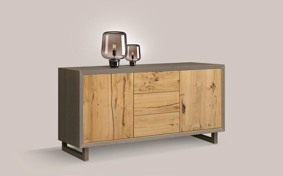 Estructura y patas «trineo» en color arcilla. 2 puertas laterales en roble natural, con sistema de apertura push-pull; 3 cajones centrales en roble natural.