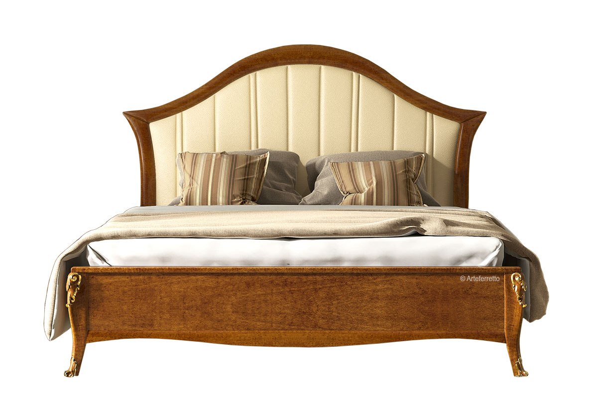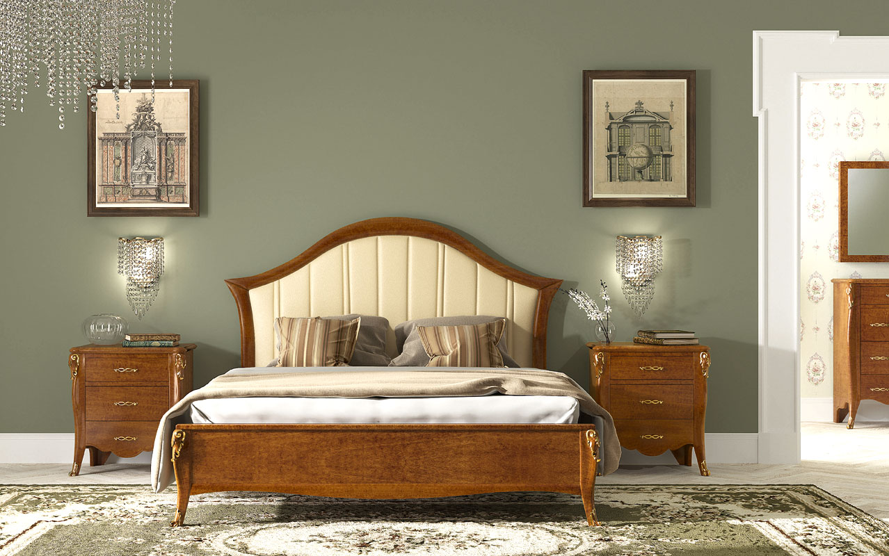 Preciosa cama de estilo clásico con mucho charme. La cabecera tapizada con tela o eco-cuero le da un aspecto suave y ligero.