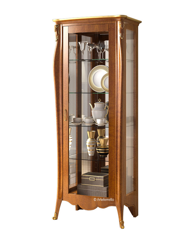 Extremadamente luminosa, en la parte delantera tiene dos grandes puertas de vidrio, enriquecidas con hermosas manillas estilizadas. Los paneles a lado están abiertos y hacen resaltar de la mejor manera posible todos los objetos que se pueden guardar en sus finos estantes de cristal.