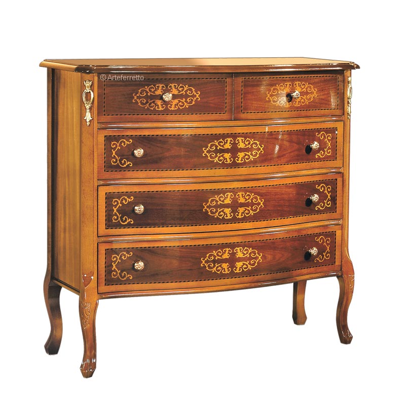 Cómoda elegante con 4 cajones espaciosos, embellecidos en el frente por una espléndida marquetería en arce.