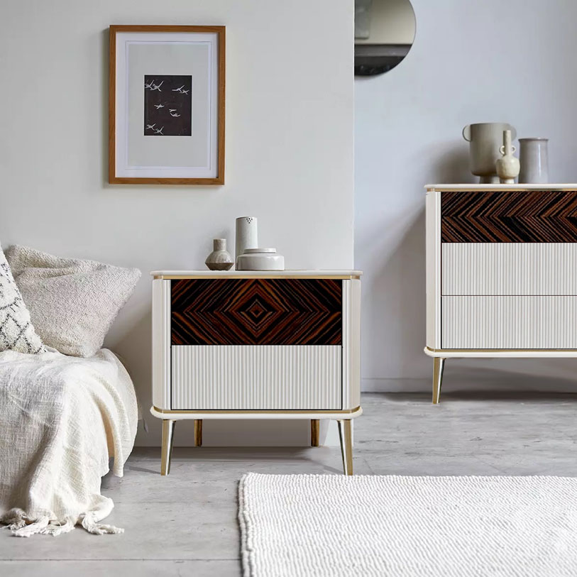 Esta original mesilla de noche de líneas limpias y luminosas es ideal para aportar elegancia a todo el dormitorio.