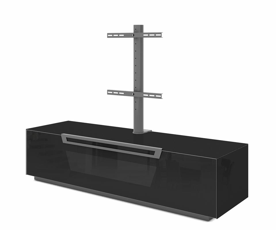 Elegante mueble de TV de diseño refinado. Su línea esencial, con perfiles apenas sugeridos, armoniza la esencia del motivo central, que nace de la particular forma del tirador y continúa en un diseño rebajado en el frontal de cristal.