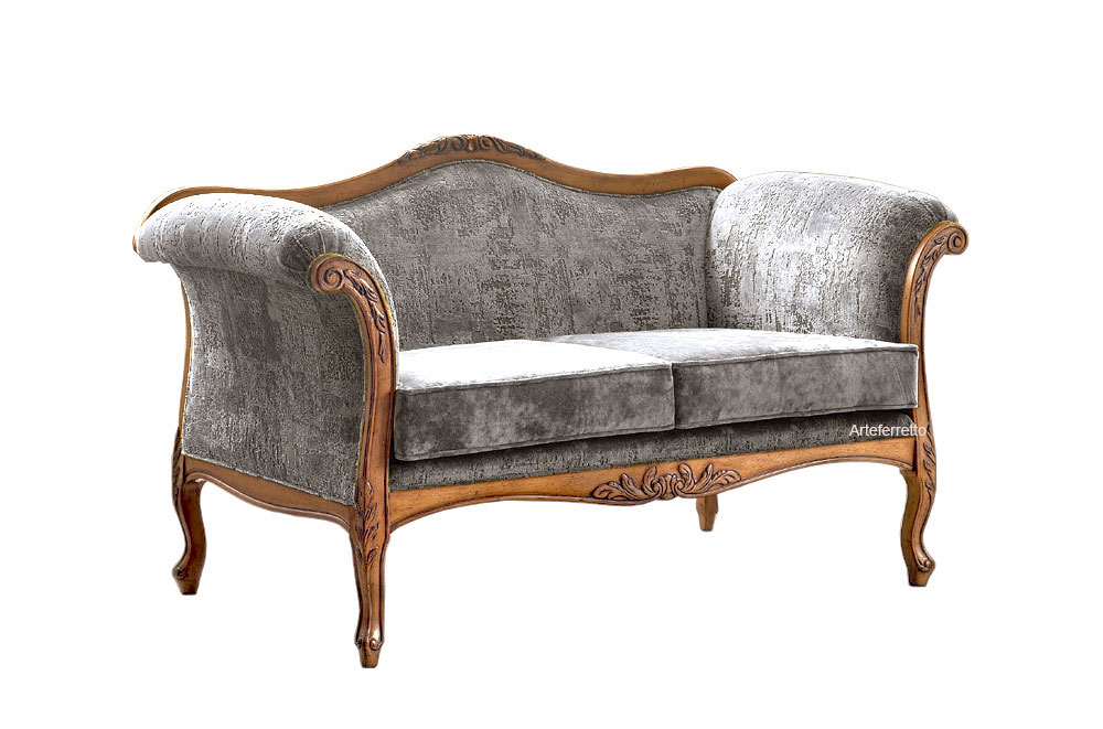 Un sofá refinado que combina una elegante estructura de madera finamente tallada con una preciosa tapicería.