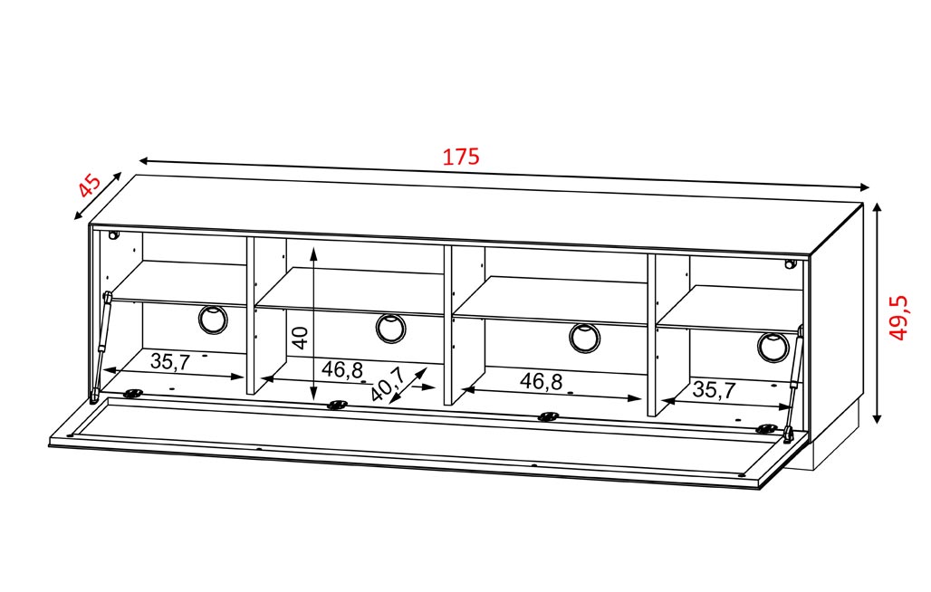 El mueble está equipado con 4 puertas de apertura a presión. Las puertas sin tirador se abren y cierran fácilmente con herrajes push-to-open.