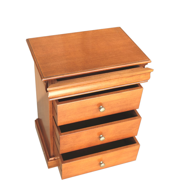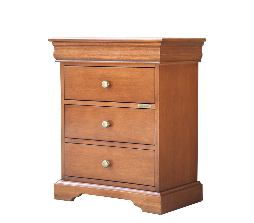 Mesita de noche clásica de estilo Luis Felipe, ideal para el dormitorio u otro contexto de decoración en el que resulte útil disponer de 4 cómodos cajones en un espacio muy estrecho.