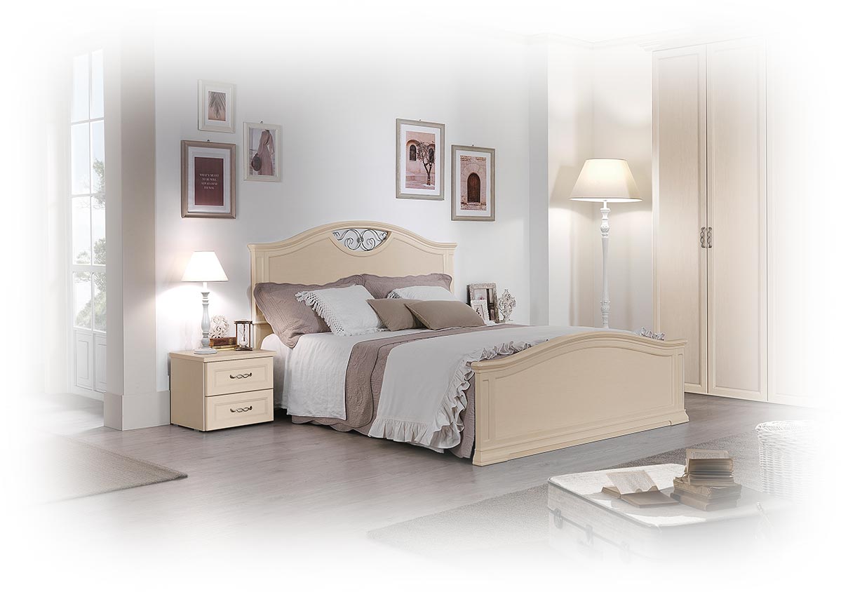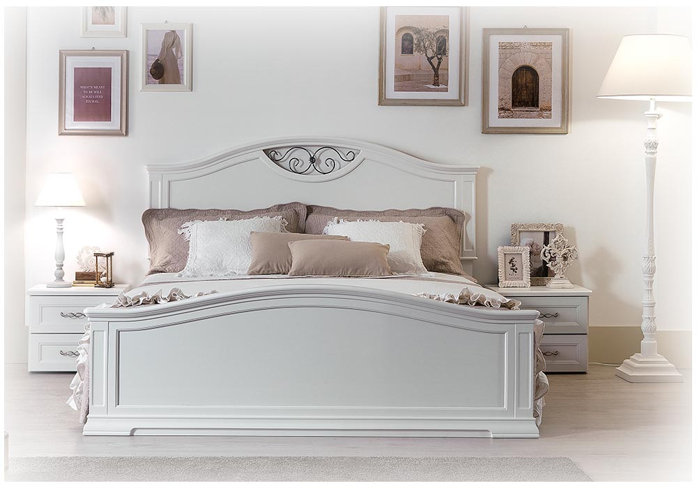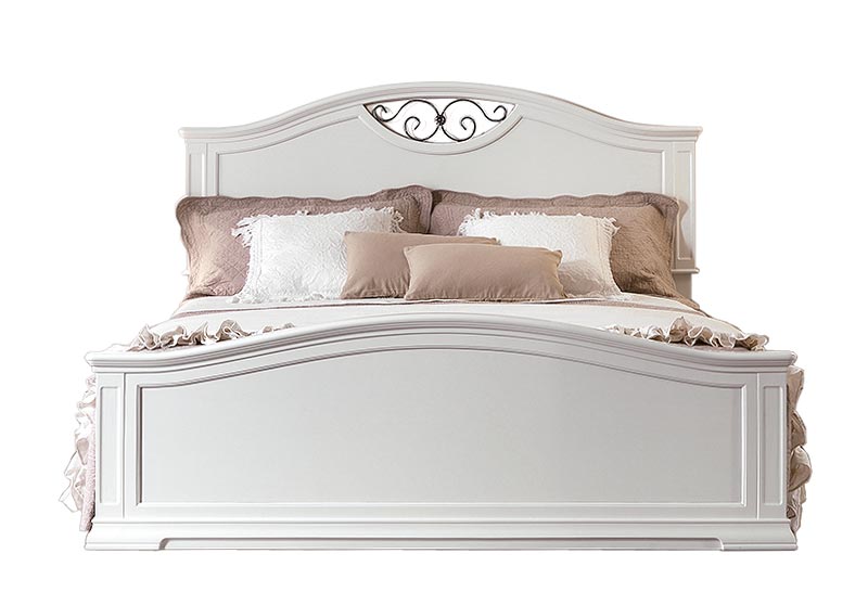 Una hermosa cama de estilo clásico, caracterizada por la línea sinuosa del cabecero y el piecero.