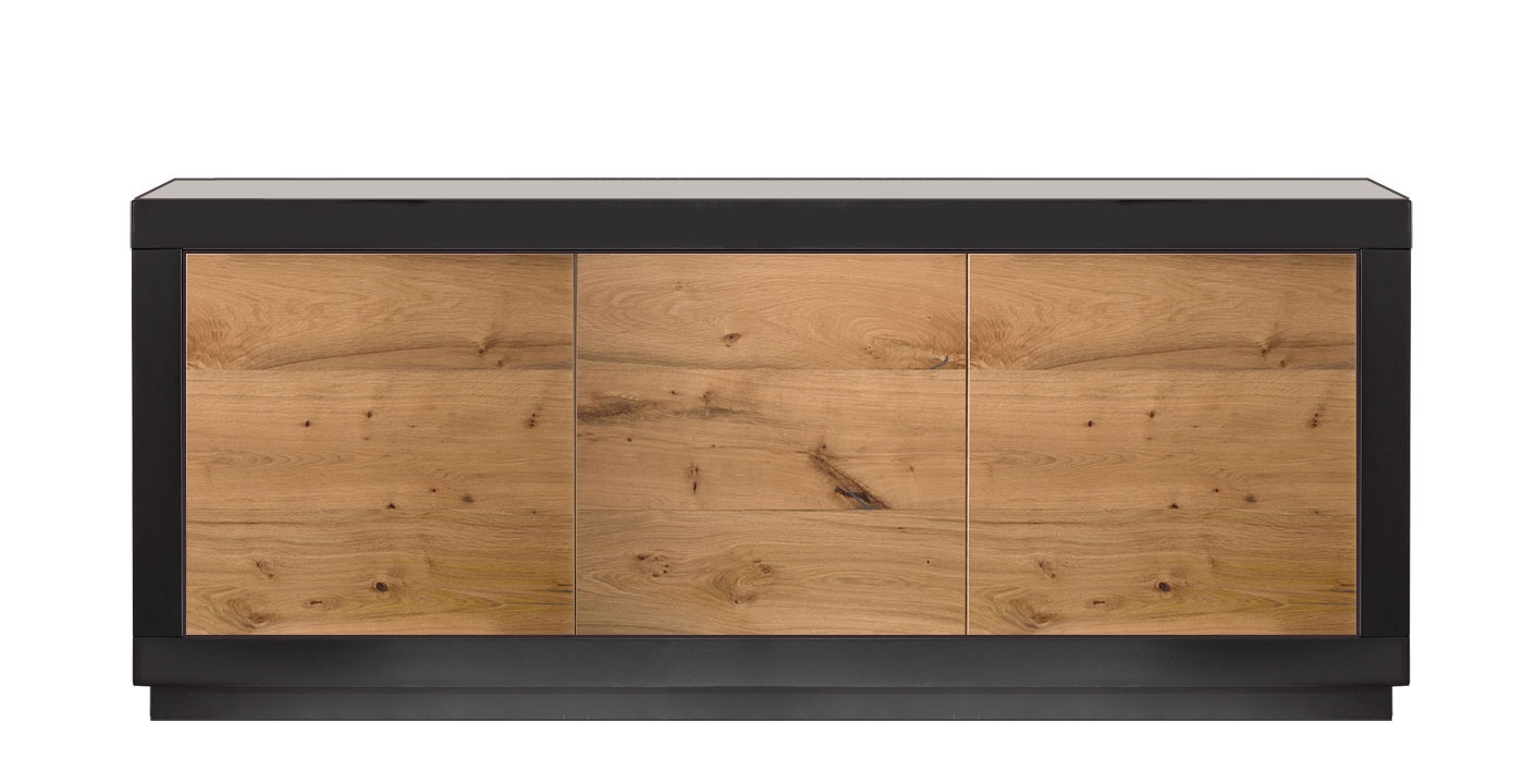 Un aparador de madera de 3 puertas con marco negro y puertas de madera natural que puede colocarse en cualquier habitación de su hogar.