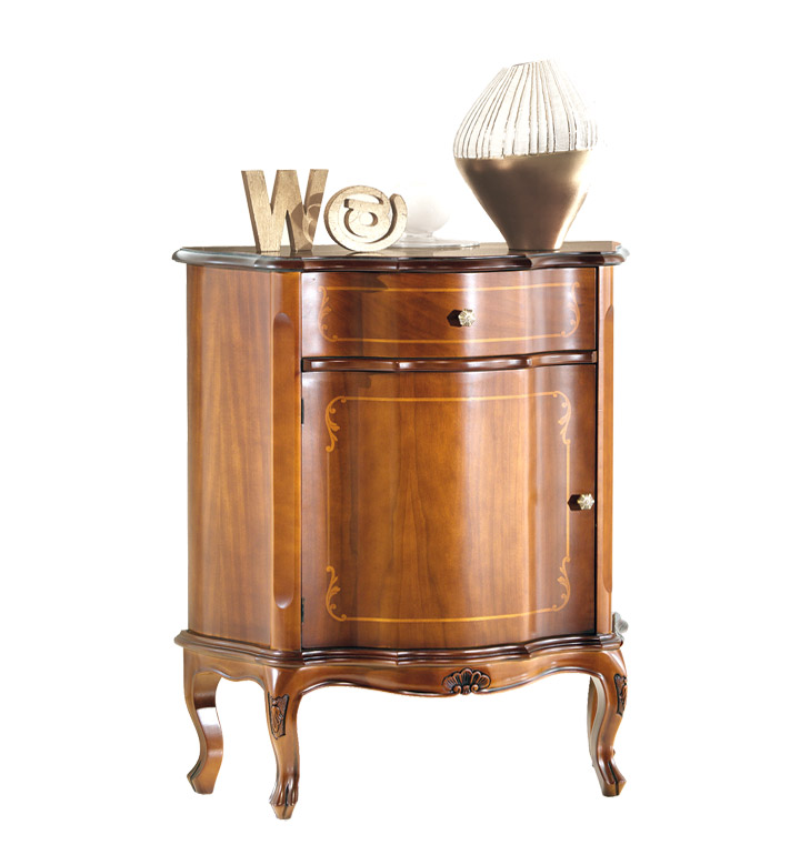 Equipado con un cajón y un compartimento cerrado por una puerta con marquetería, es perfecto para guardar objetos de diversos tipos y tamaños. El compartimento también cuenta con un estante regulable en altura.