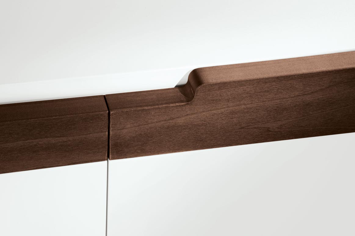 Tiene dos compartimentos cerrados por puertas uniformes de MDF lacado en blanco. Los dos tiradores de madera maciza de la parte superior del mueble son un detalle elegante.
