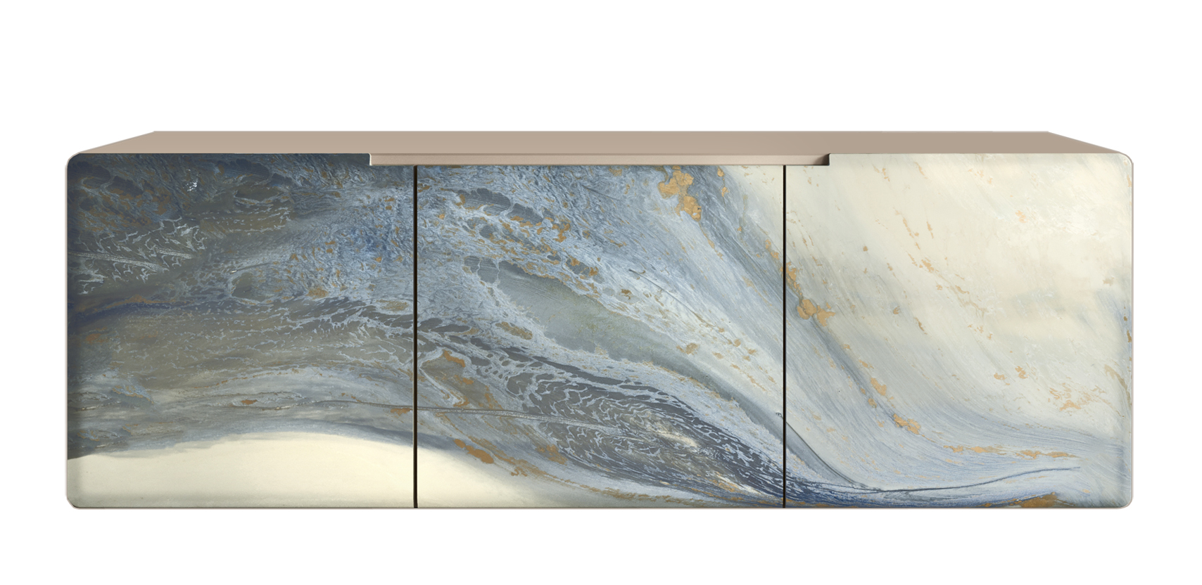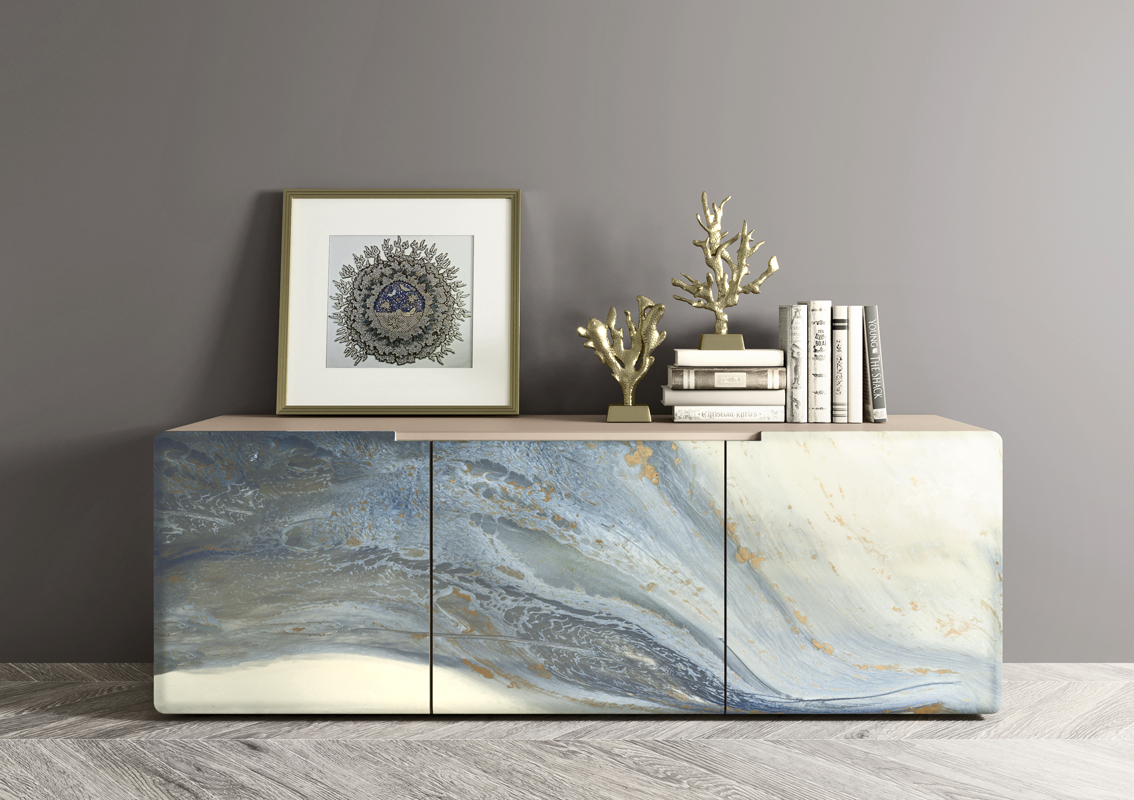 La particularidad de este aparador son sus puertas de resina. Este material hábilmente trabajado crea un diseño único y fascinante.