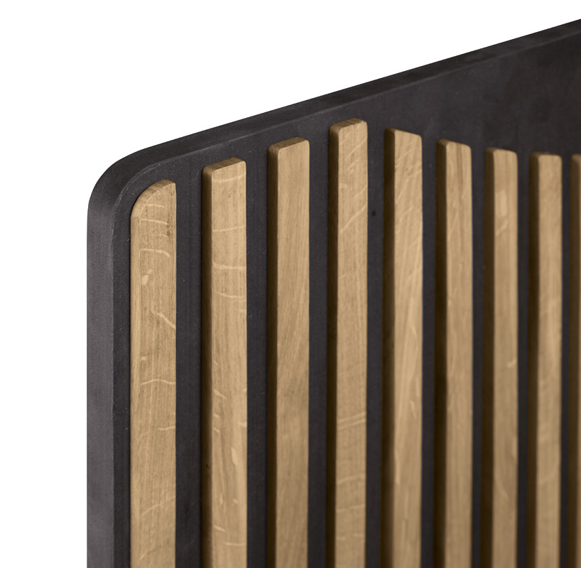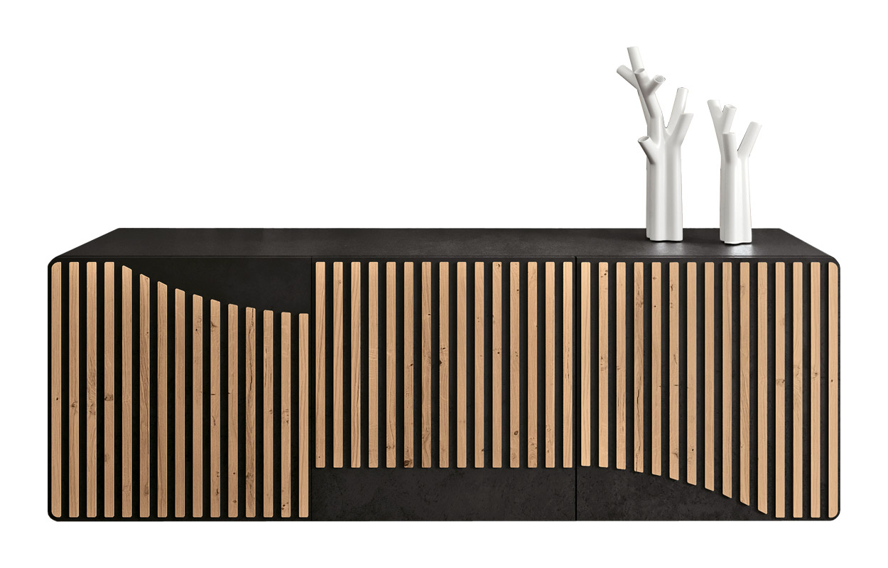 En las puertas delanteras, las tiras de roble nórdico crean un motivo geométrico y confieren movimiento a todo el mueble.