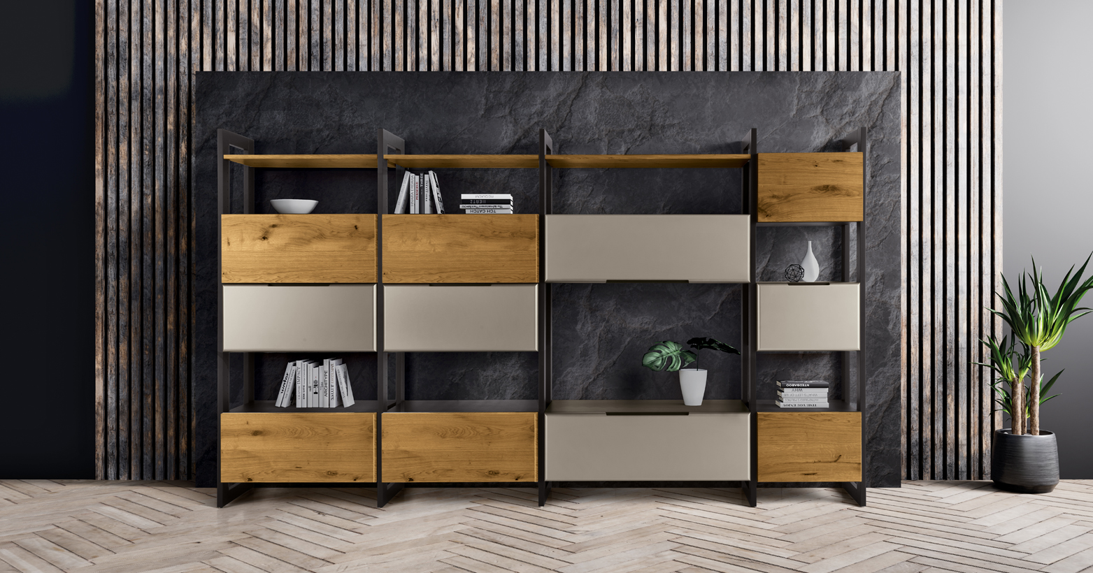 Funcional y espaciosa, esta composición de más de 3,5 metros de largo es ideal para amueblar un salón moderno/contemporáneo o como librería en un despacho.