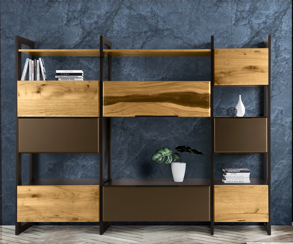 La particularidad de esta composición es la inclusión de elementos de tablones de roble nudoso que dan un toque rústico al mueble y al entorno en el que se coloca.
