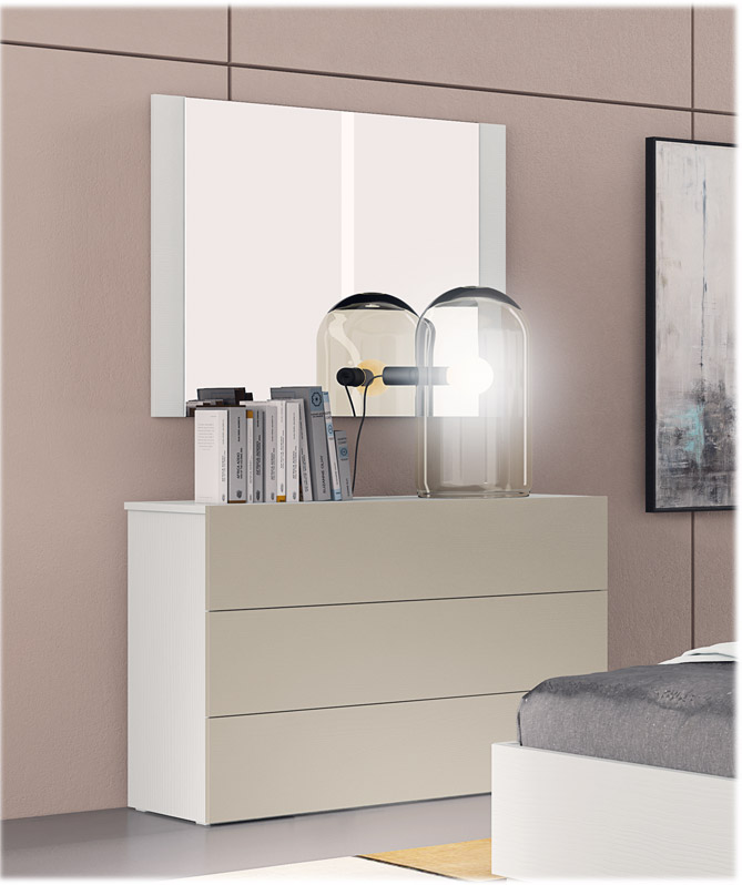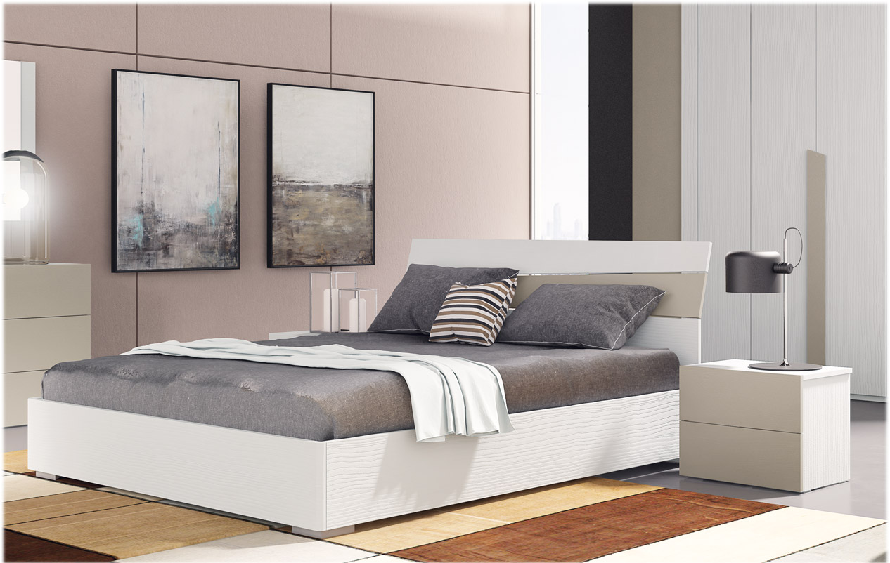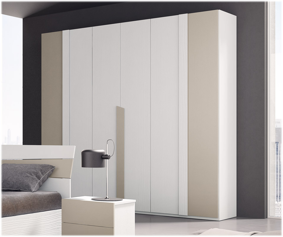 Consta de: armario con 6 puertas batientes, 2 mesitas de noche con dos cajones, 2 cajoneras con seis cajones, cama. Presentados aquí en acabado en lárice blanco y olmo.
