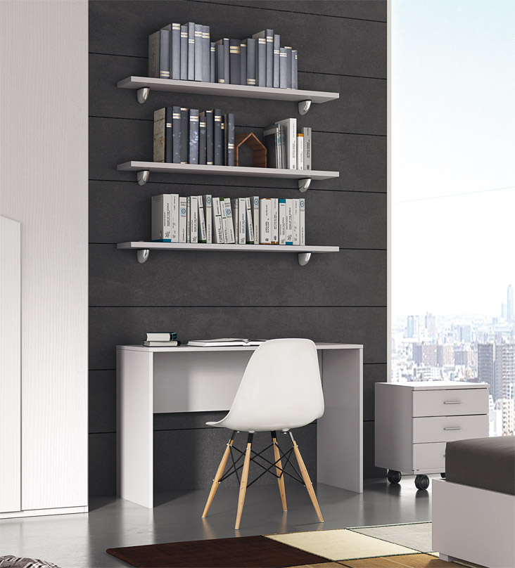Consta de: armario con 3 puertas batientes, mesita de noche con dos cajones, cajonera con tres cajones con ruedas, escritorio, 3 baldas, cama de 120 cm con contenedor. Presentados aquí en acabado lárice blanco.