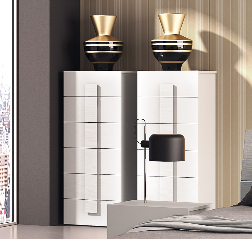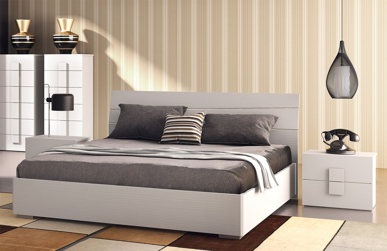 Consta de: armario con 6 puertas batientes, 2 cajoneras con seis cajones, 2 mesitas de noche con dos cajones, cama con contenedor. Presentados aquí en acabado lárice.