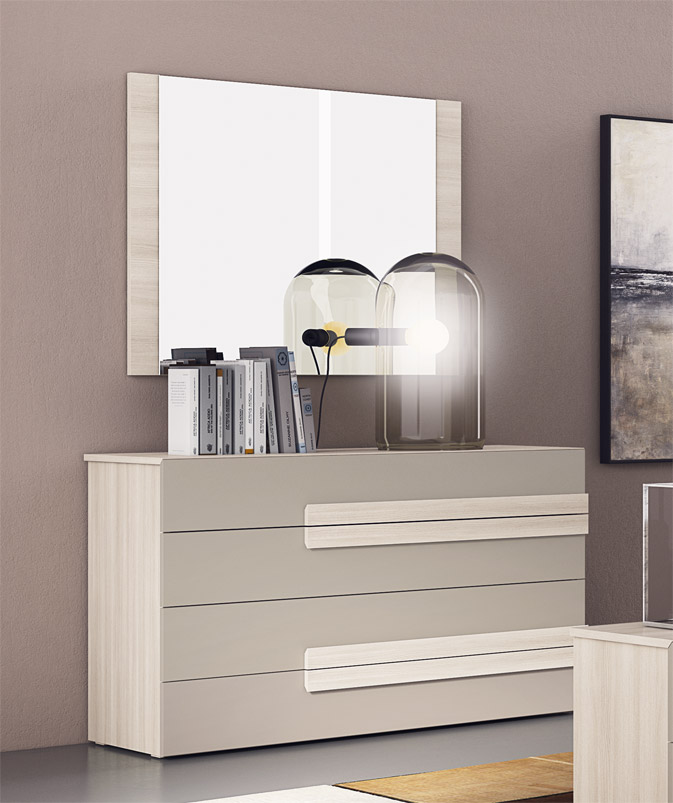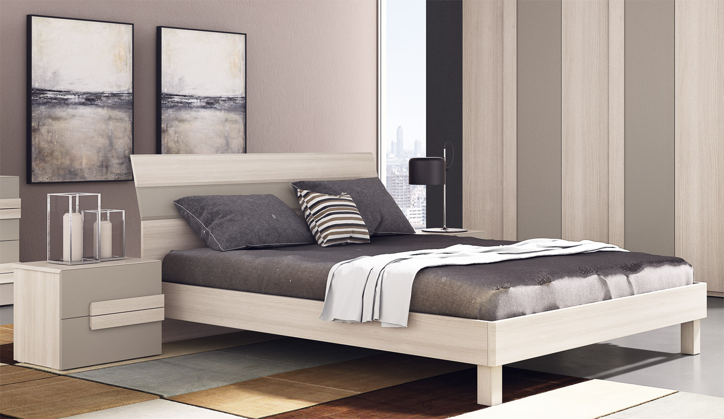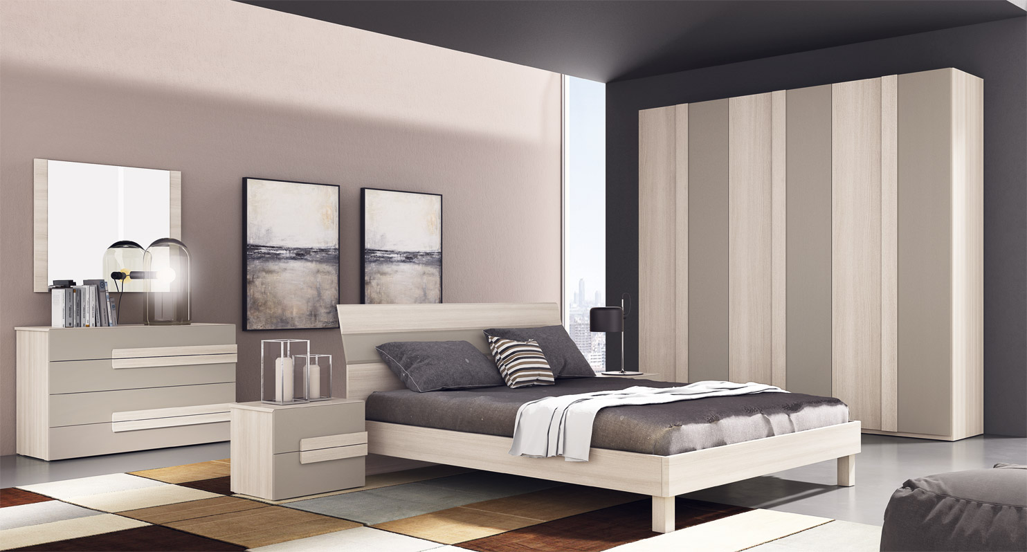 Consta de: armario con 6 puertas batientes, 2 mesitas de noche con dos cajones, cómoda con cuatro cajones, cama y espejo. Presentados aquí en acabado olmo y gris pardo.