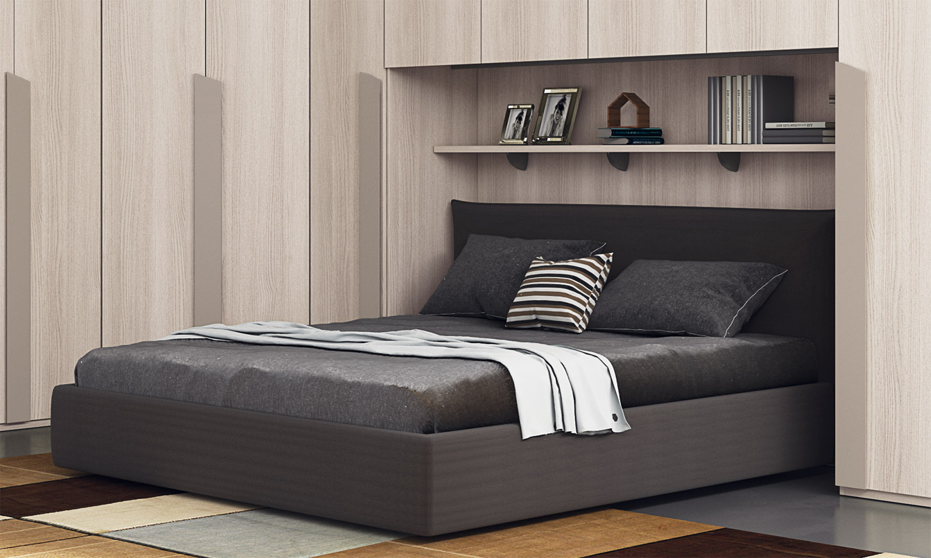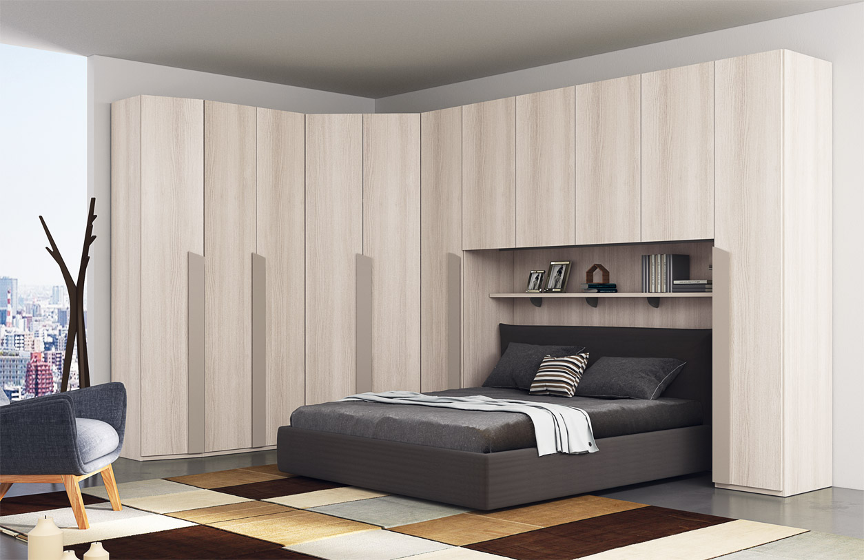 Consta de: armario esquinero con puente, balda y cama. Presentados aquí en acabado olmo y gris pardo.