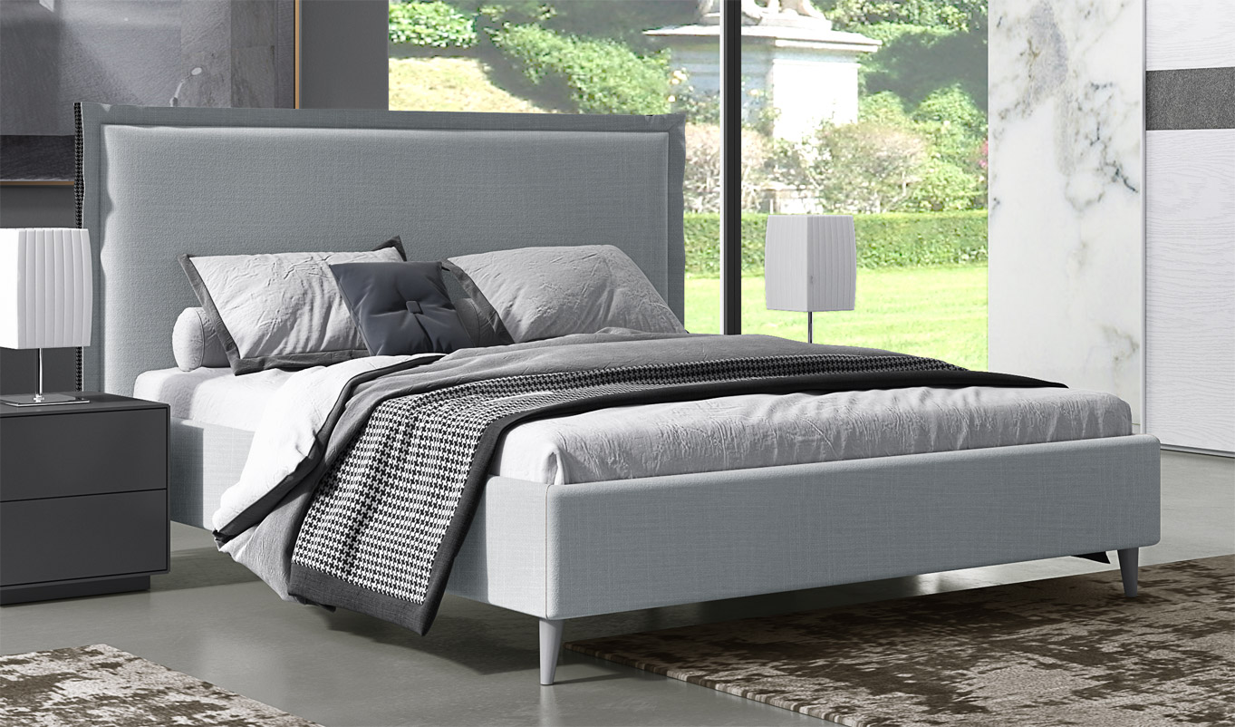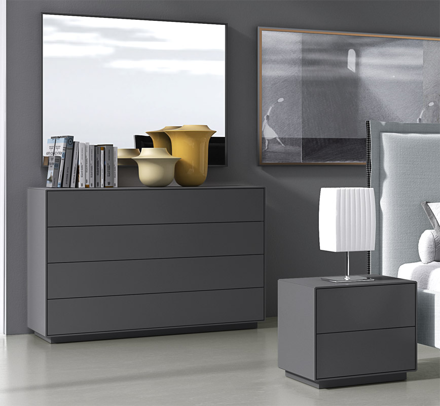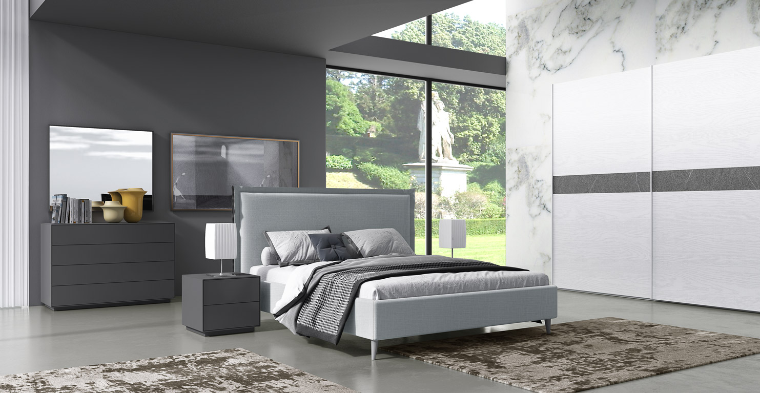 Consta de: armario con 2 puertas correderas, 2 mesitas de noche con dos cajones, cómoda con cuatro cajones, cama acolchada y espejo. Presentados aquí en acabado gris oscuro, fresno yeso y piedra.